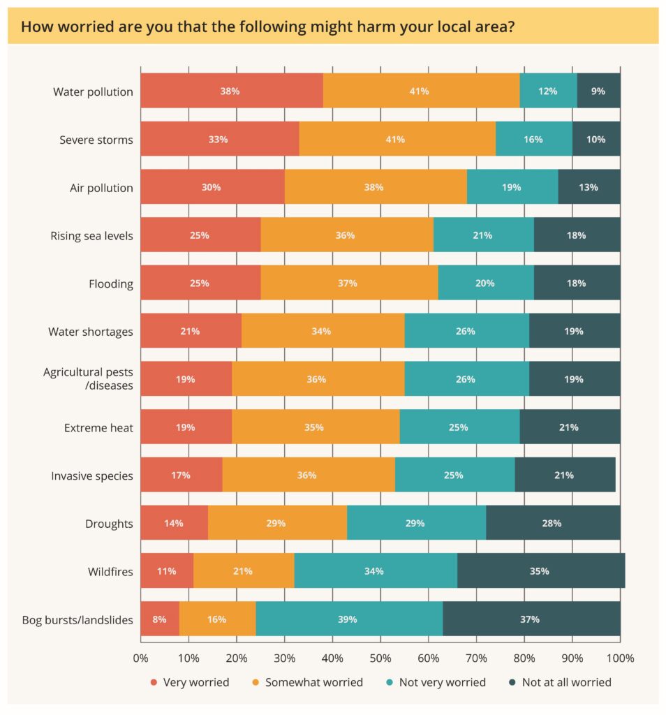The survey asked people how worried they were about environmental harms in their local area – local water pollution was the top concern.