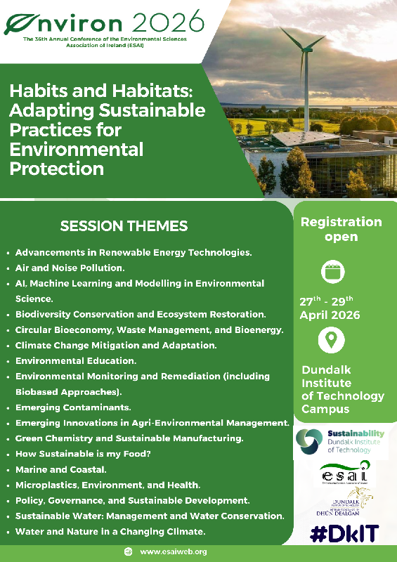 Dundalk Institute of Technology (DkIT) will host the ESAI 36th Irish Environmental Researchers Colloquium, Environ 2026, from 27 to 29 April 2026.