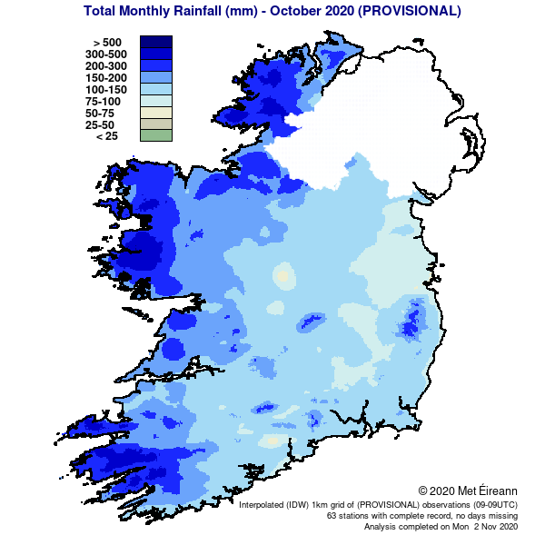 The majority of meteorological stations recorded monthly rainfall totals above their long-term average for October. Parts of the south west, west and north west recorded well above the long-term average, with the Valentia Observatory, Co Kerry recording the month’s wettest day.