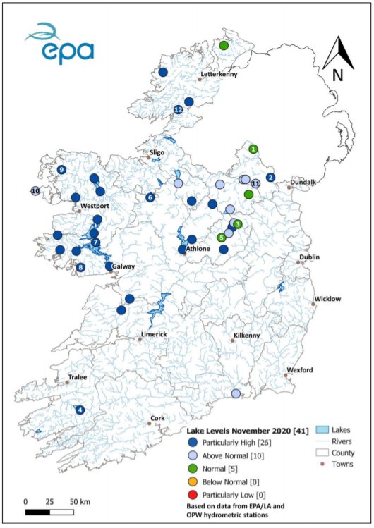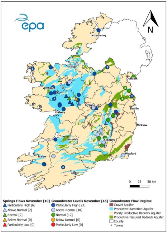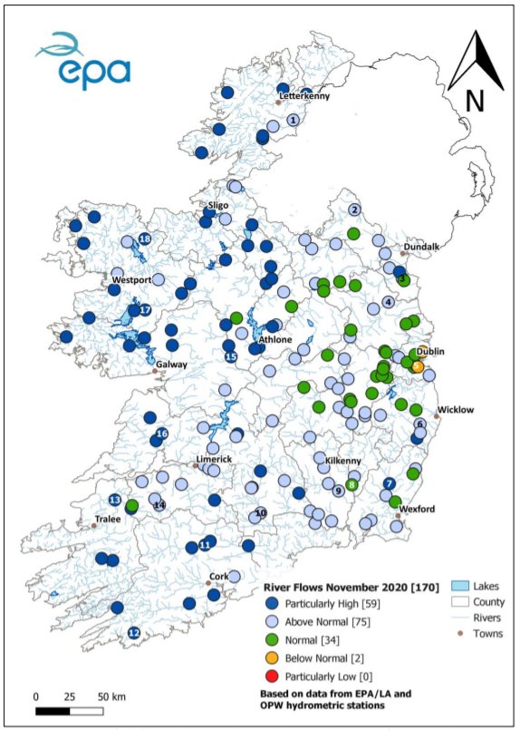 The majority of meteorological stations recorded monthly rainfall totals above their long-term average for November. It was wettest in the west, northwest and southwest. However, the east, especially the greater Dublin area, experienced below average rainfall for November resulting in river flows ranging from particularly high in the west and south west to normal and below normal in the east.
