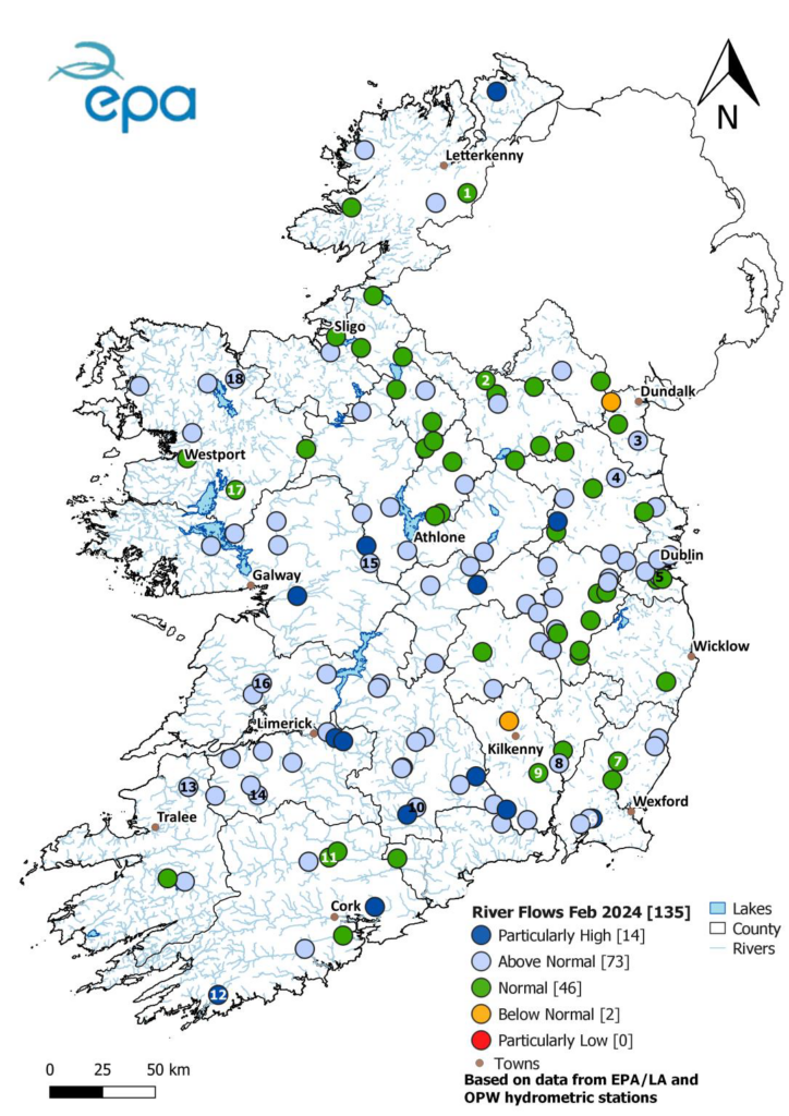 The EPA hydrology bulletin for February is now available to download. Rainfall was above the long-term average in most locations. 64% of river flows were above the long-term normal range with increases in flow generally observed in the south and west. Average groundwater levels in February were higher at 53% of monitoring wells compared to January.