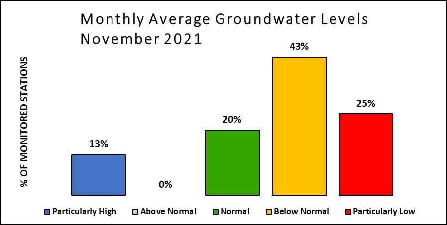 Average groundwater levels increased between October and November at 60% monitoring wells analysed. November groundwater levels were classified as ‘particularly high’ at 5 (13%), ‘normal’ at 8 (20%), ‘below normal’ at 17 (43%) and ‘particularly low’ at 10 (25%) monitoring wells across the country. ‘Particularly low’ groundwater levels are observed in the eastern half of the country.