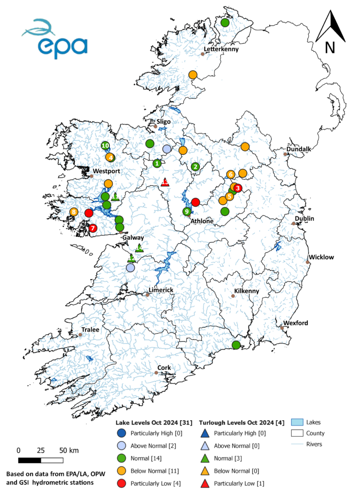- 45% of the lake and turlough monitoring stations observed levels below the long-term normal range,