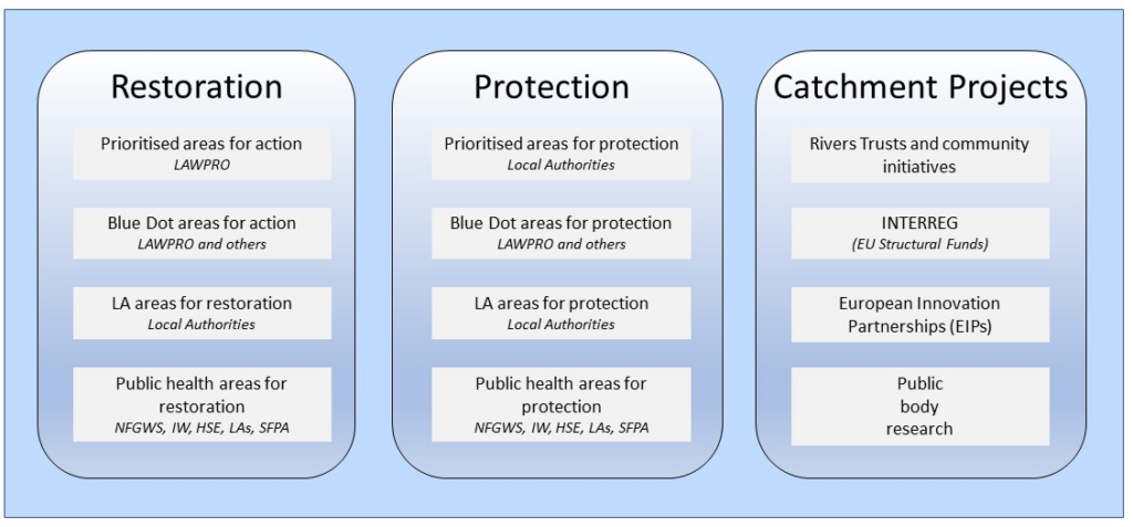 Each area for action will have a designated lead such as LAWPRO, a local authority, the National Federation of Group Water Schemes, Inland Fisheries Ireland etc. This approach aims to capture all the water quality improvement work that is happening across the country. This approach will also align actions being carried out for other purposes with the objectives of the RBMP, where possible, so that synergies can be identified, and multiple benefits can be achieved.