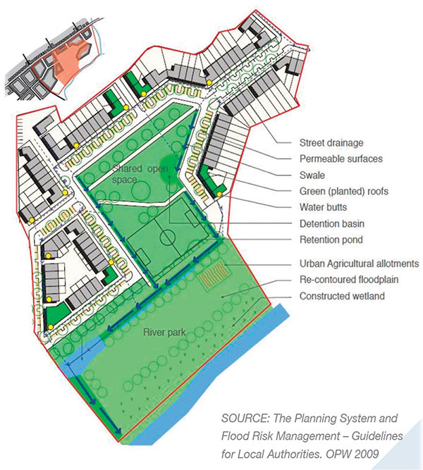 This brings challenges in terms of drainage, traditionally addressed by hard engineering options (concrete gullies, pipes, drains etc) resulting in increasing flood and pollution risk. Sustainable urban Drainage Systems (SuDS) to address flood risk were introduced several decades ago and are promoted in The OPW’s (2009) Guidelines for Planning Authorities “The Planning System and Flood Risk Management”.