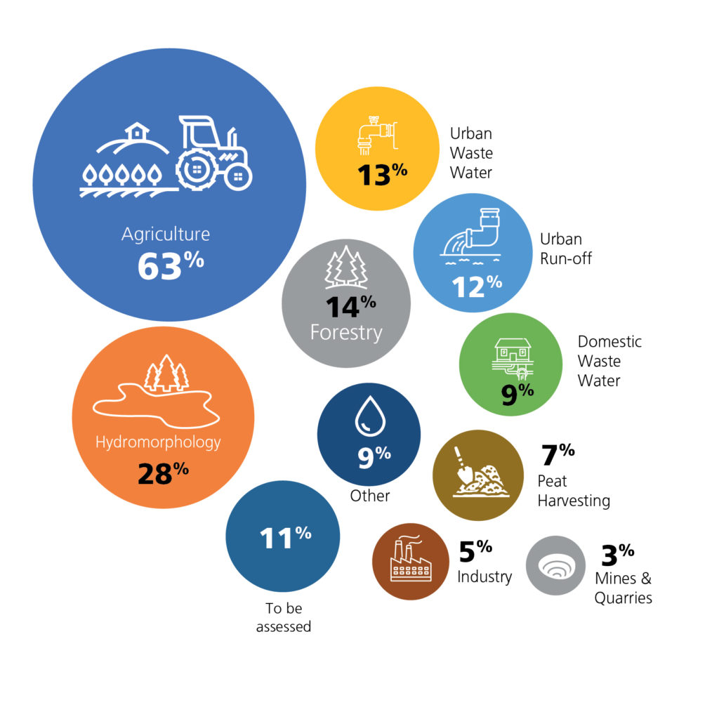 The main pressures on water quality are agriculture, physical changes such as land drainage and dredging, forestry activities and discharges from urban wastewater. These activities can lead to run-off of nutrients, sediment and pesticides and damage to the physical habitat of waterbodies.